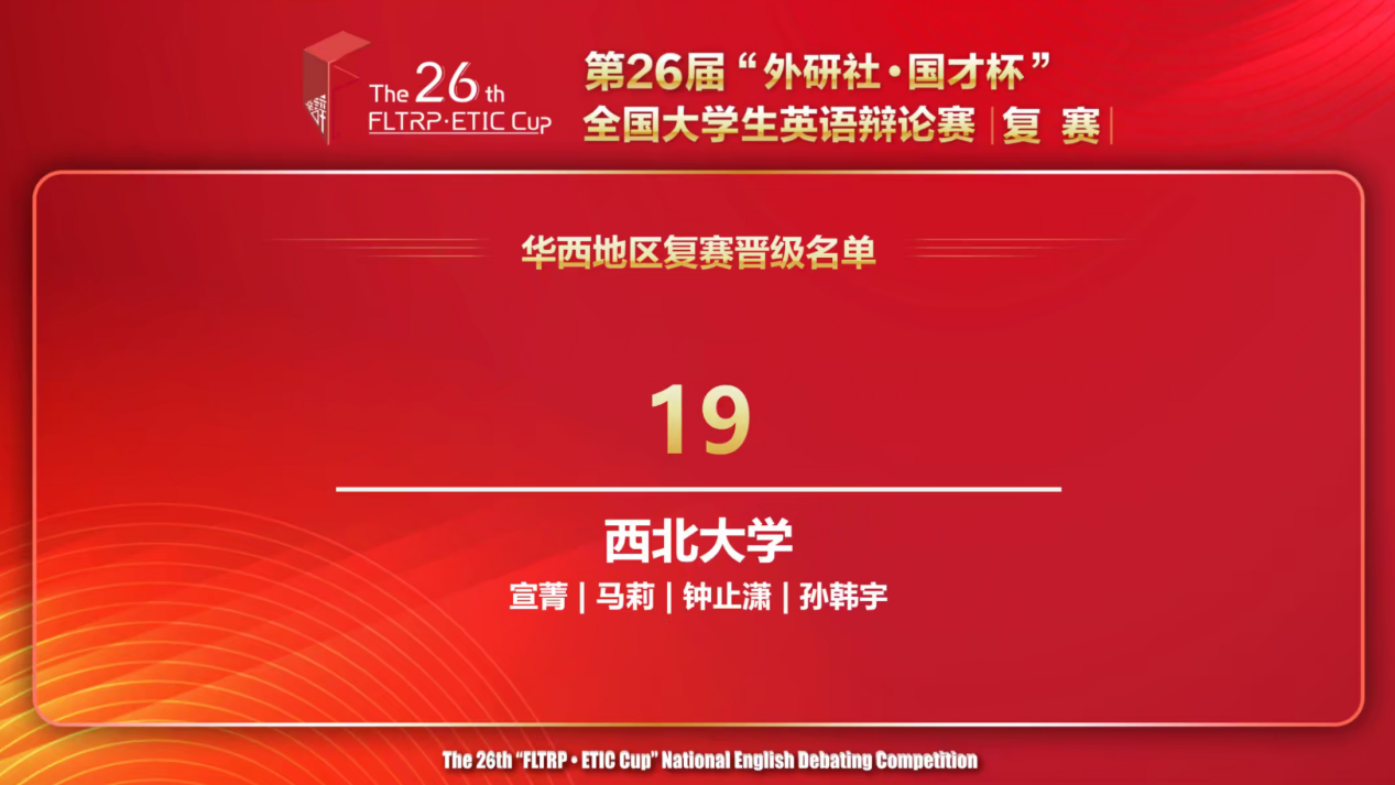 2024年4月20-21日,第26届“外研社·国才杯”全国大学生英语辩论赛华西地区复赛在线上举行,本次复赛共有来自华西地区12个省市自治区共90支队伍代表各学校参赛。历经两天五轮高强度的比赛,由外国语学院教师宣菁、马莉担任指导教师,来自我校经济管理学院的2022级数理经济学专业钟止潇和2023级工商管理类孙韩宇同学获得一等奖并成功晋级全国总决赛!